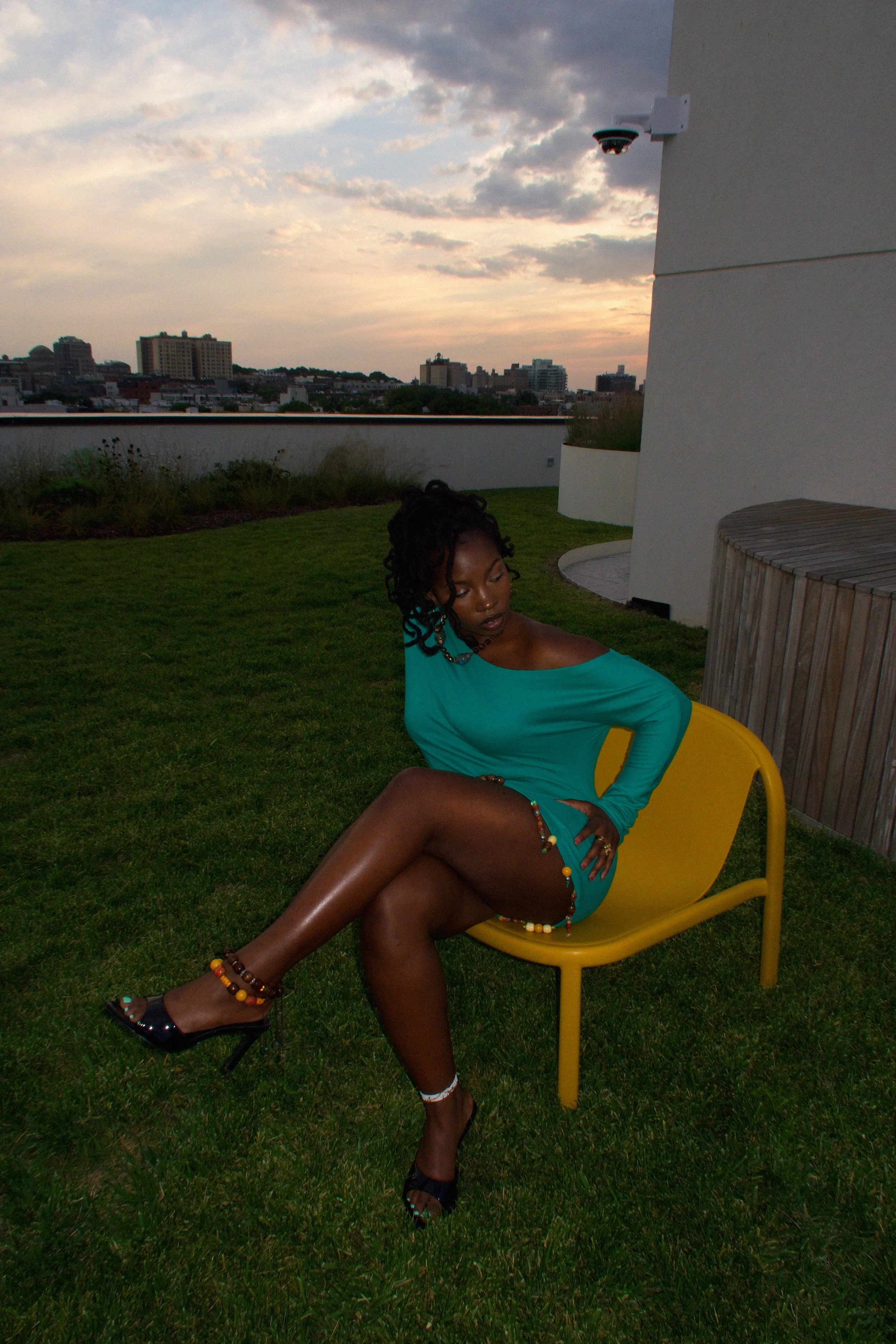 Safa wears a jersey knit Asymmetrical Dolman Mini Dress featuring a fringed beaded hem.