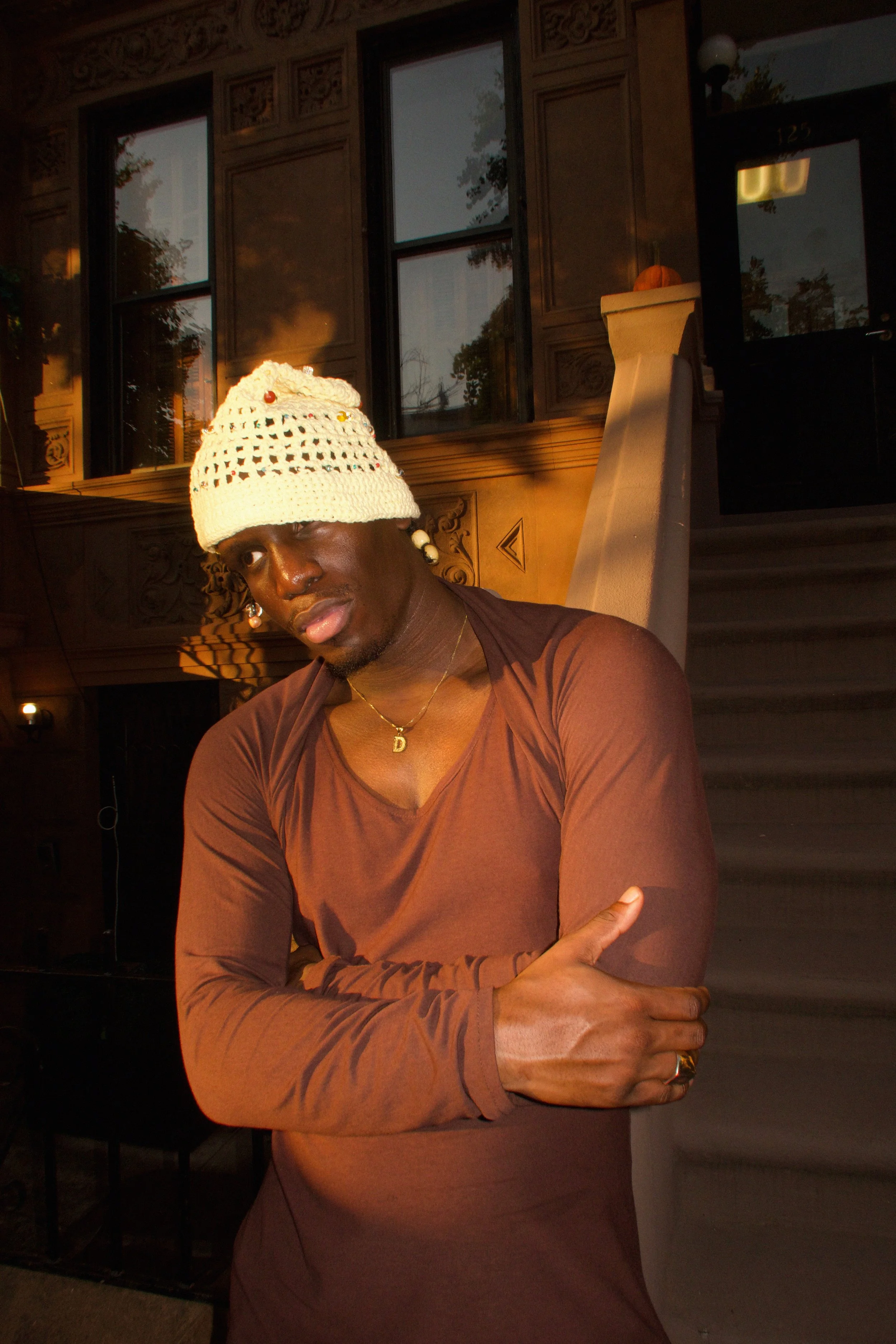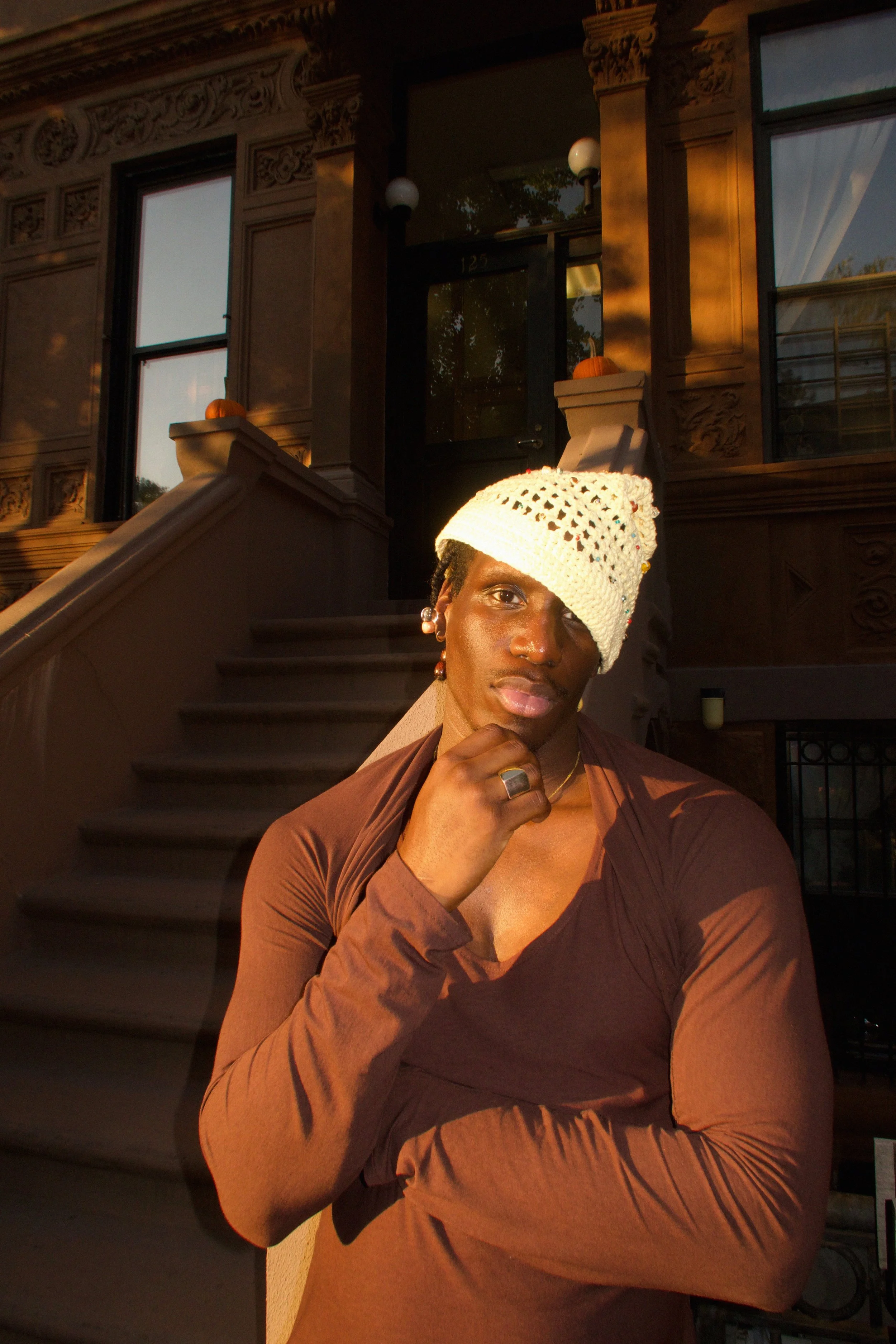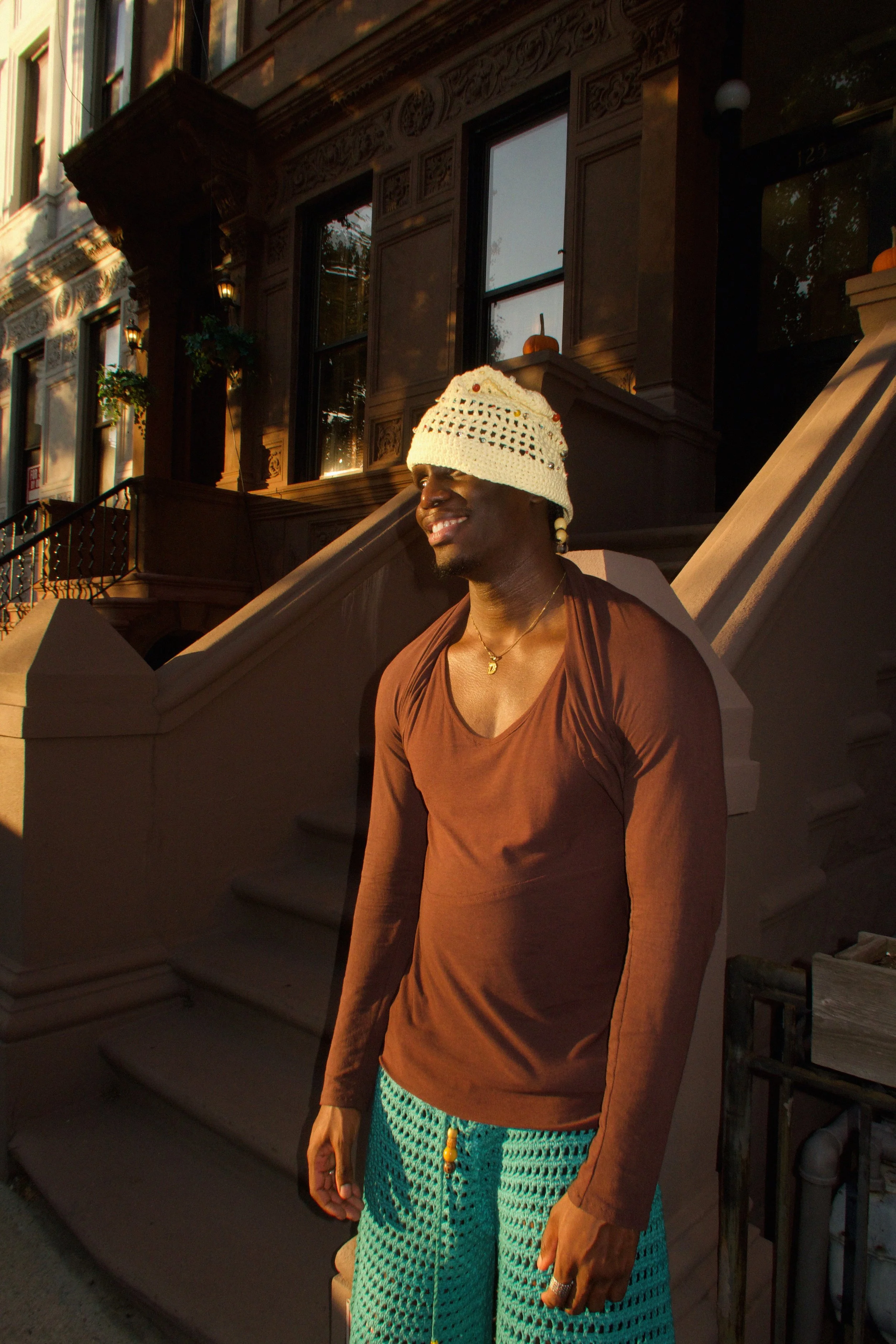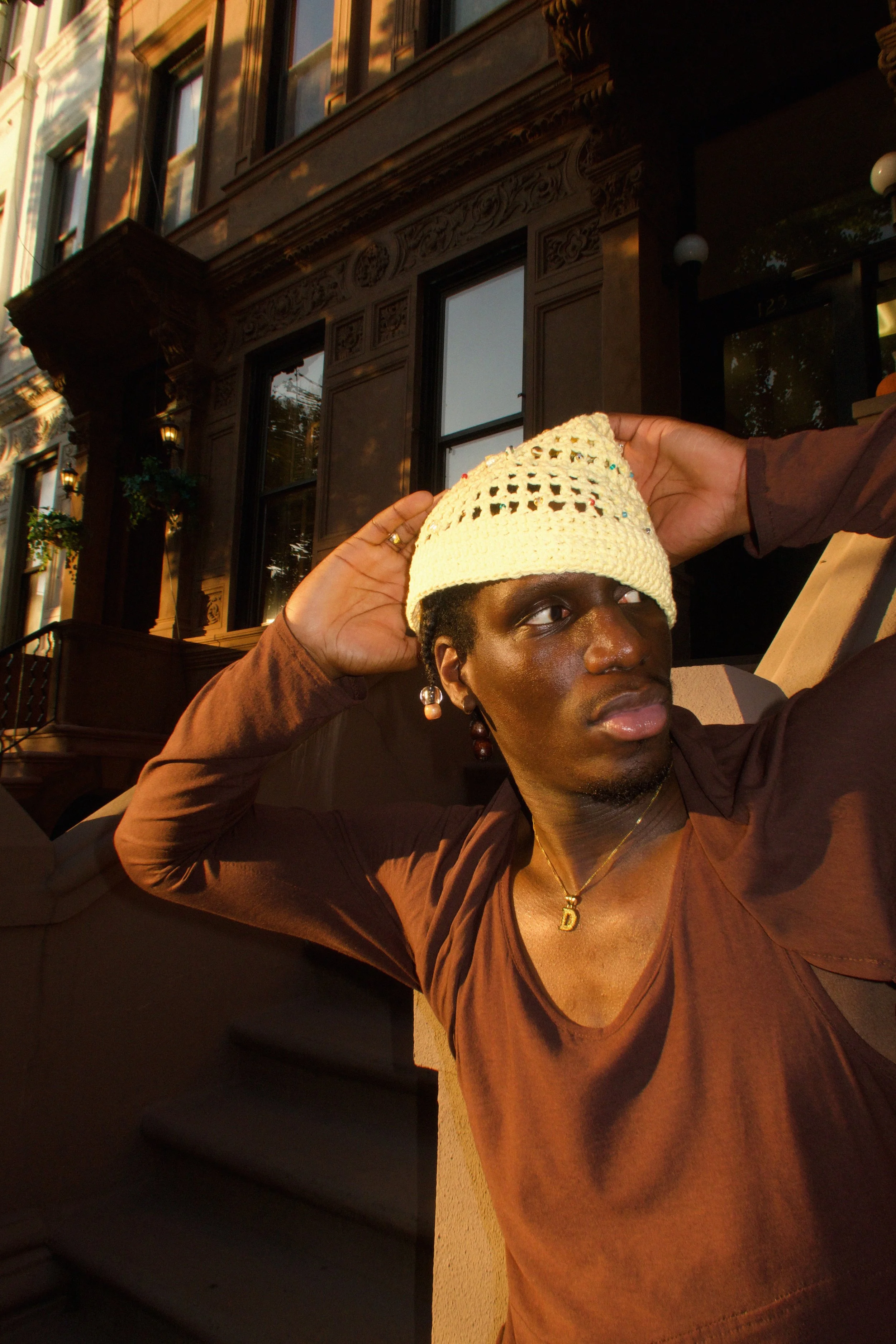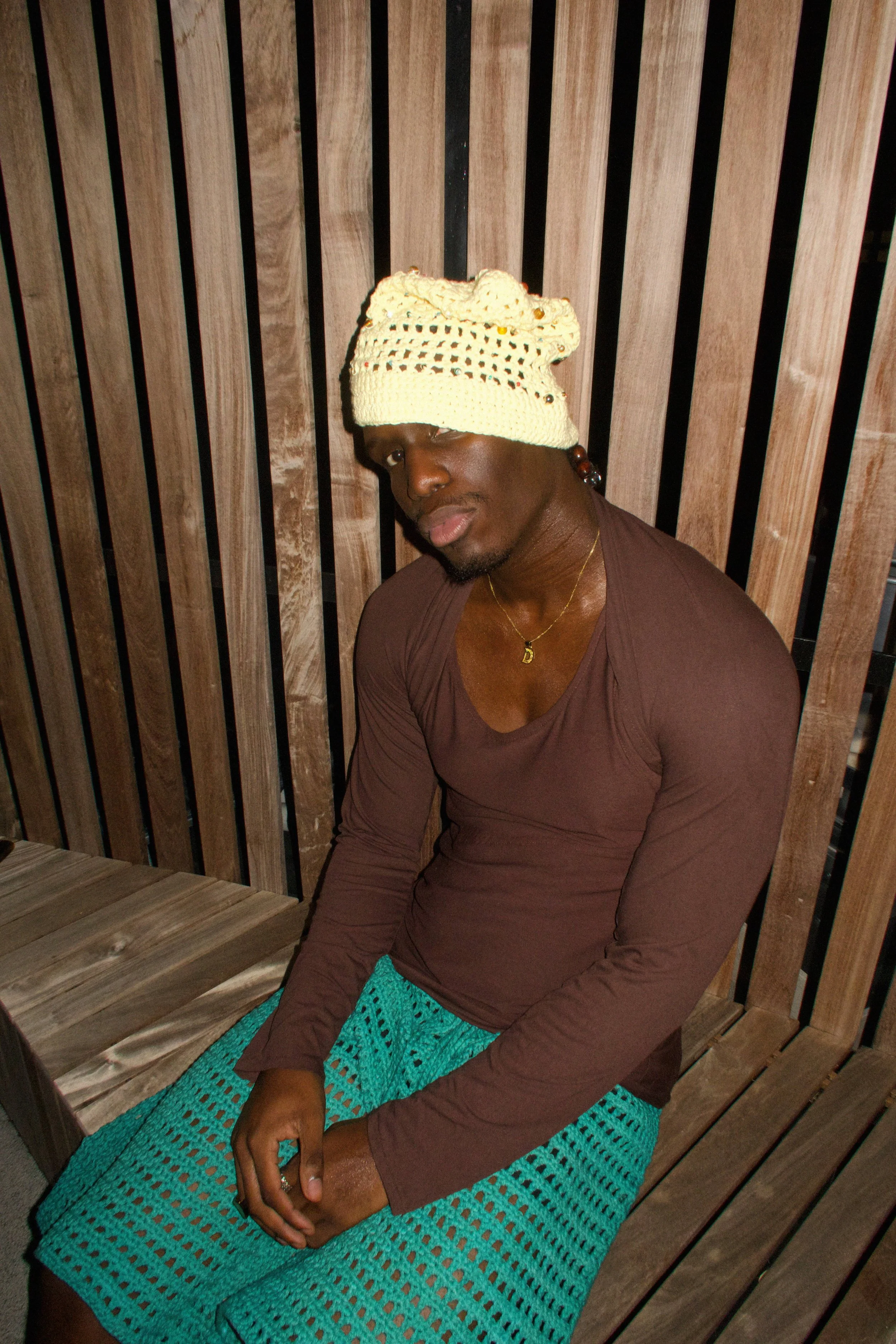 Dawens wears a bamboo cotton Bolero and Top set, paired with acrylic Crochet Mesh Shorts featuring a beaded drawstring detail. Topped off with a slouchy beaded cotton Mesh Beanie.